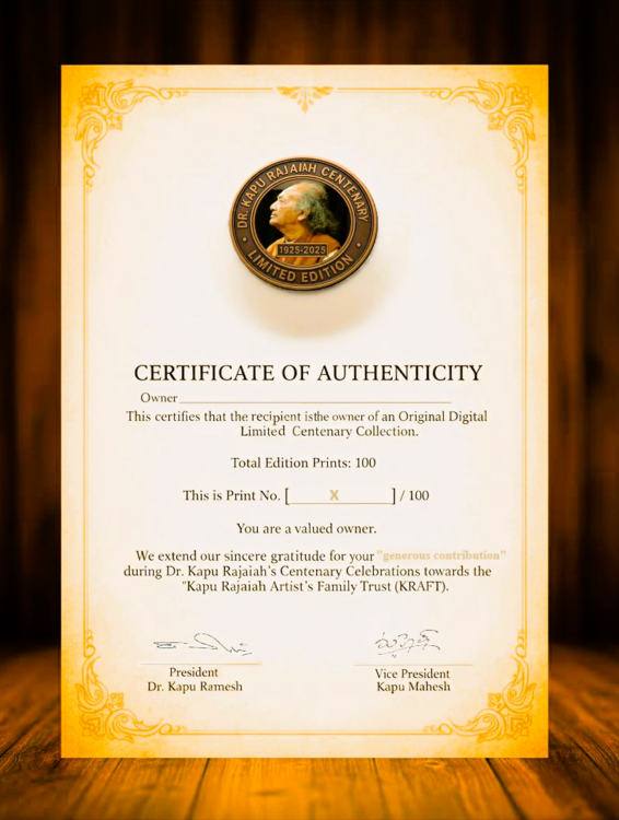 As part of these centenary celebrations, we are proud to announce the release of a Centenary Limited Edition Painting, created in remembrance of Dr. Kapu Rajaiah’s invaluable contribution to Indian art and culture, especially the Folk paintings of Telangana. This exclusive artwork is priced at ₹45,000and is being released in limited numbers (100) to preserve its artistic and commemorative significance.